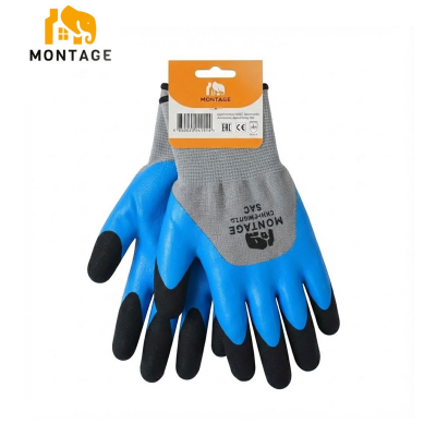Ձեռնոց սինթետիկ թելից լատեքսապատ կրկնակի փրփրացված, մոխրագույն-կապույտ-սև MONTAGE 56գր N10 կախիչով